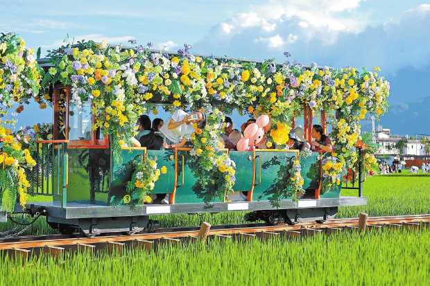 图为游客乘坐“有风号”小火车拍摄沿途田园风光。